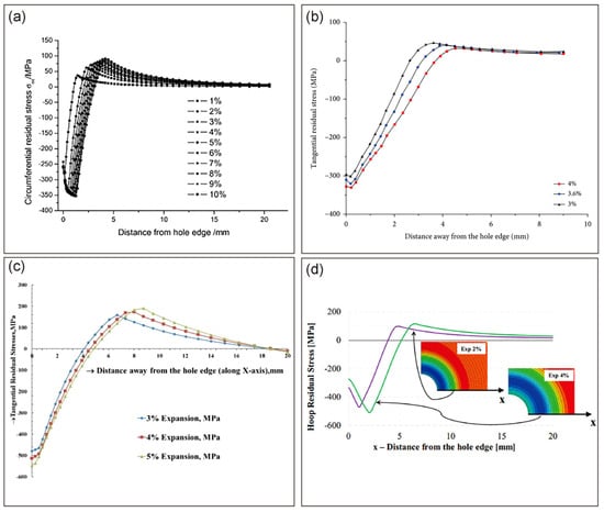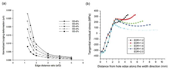 Typically, a ratio of e/D is used to determine the edge distance ratio (EDR). D is the hole diameter, and e is the distance between the hole center and the plate’s undamaged edge. Due to residual stresses produced by CE and the interaction of the fastener with the unstressed edges of the plate when the edge distance is minimal, the tangential residual stress distribution around the fastener hole is no longer symmetrical to the hole center. Liu et al. [50] found that when the EDR of TC4 titanium alloy specimens was reduced, the residual tangential compressive stresses in the CE hole decreased and the fatigue life was reduced. Figure 5 shows the distribution of residual stresses for different EDRs at different expansion degrees and different hole margins. As the edge distance decreases relative to the EDR, the residual tangential compressive stress at the hole edge decreases. CE slows the fracture propagation as intended at all edge ratios. This delay is brought on by a decrease in the stress intensity factor of the fractures produced by the cold expansion holes. As a result, Fatigue Technology Inc (FTI) recommends 1.75 as the minimal e/D limit [51]. The residual stress field has no impact if e/D is higher than 3 [52].