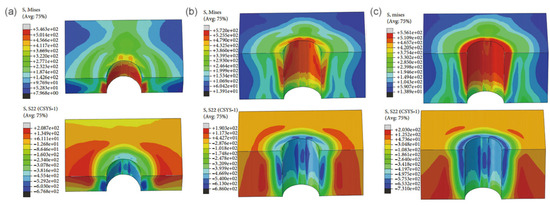 Von Mises stress under different thicknesses. (a) 6 mm; (b) 8 mm; (c) 10 mm [33].