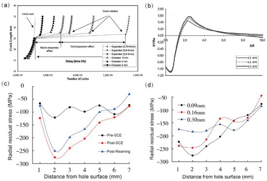 (a) Crack length vs. number of cycles; (b) evolution of the residual tangential stresses with the different diameters; (c) radial residual stress in SCE; (d) radial residual stress of different reaming values [18,57].