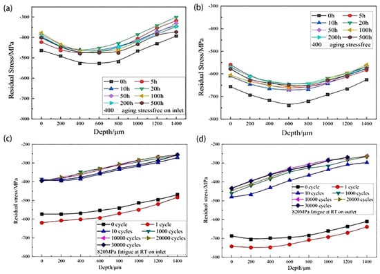 The compressive residual stress profile change: (a,b) multiple aging times at 400 °C at the inlet and the outlet, respectively; (c,d) multiple fatigue cycles under 820 MPa at RT at the inlet and the outlet [64].