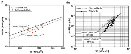 da/dN vs. K plot for NCE and CE hole specimens (a) TC4 [74] (b) 2024–T3 [75].