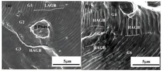 In addition, grain boundaries (GB) can inhibit short crack extension, and changes in the crystal orientation of adjacent grains can lead to the tilting of the crack face [47,79]. Figure 13 divides the GB into six regions and illustrates the effect of changes in GB and adjacent grain crystal orientation on FCG for AA6061-T6 holes. If the favorable slip plane of the adjacent grains is essentially in the same plane, the crack can be transmitted directly or indirectly from one grain to the other. On the other hand, if there is a deflection angle in the favorable slip plane of the adjacent grains, this can lead to tilting of the crack plane. Obviously, crack tilting or distortion favors FCG closure, resulting in longer fatigue life [78].