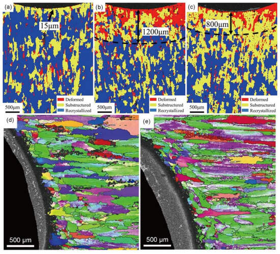 Local misorientation average angle and deformation distribution map, 7075-T6: (a) NCE specimen of 7075-T6; (b) outlet side of SCE specimen; (c) inlet side of SCE specimen; (d,e) inlet side of SCE specimen of 7075-T651 in the radial direction and tangent direction [45,81].