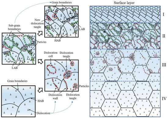 SCE treatment produces a gradient effect on grain refinement [44]. The formation of the gradient layer is associated with diverse plastic deformations at different depths in the SCE process. During deformation, dislocation slip is primarily responsible for the particle refinement that increases the strength of the material and improves its resistance to fatigue crack initiation [82,83]. The construction of the gradient nanostructure using the SCE approach is shown in Figure 15. The gradient structure can effectively prevent the spread of cracks [84].