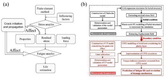 As was already noted, FEM is frequently used in the CE process to calculate the specimen fatigue life and evaluate the residual stress around the fastener. However, FEM was not used in the prior research to establish the relationship between residual stress and its affecting elements. It is necessary to establish a simulation system to obtain the optimal fatigue life of the specimen by simulating various influencing factors, such as expansion degree, edge distance ratio, friction, thickness, etc., and uniformly placing these factors in this model, as shown in Figure 16a. These variables have an impact on residual stress, which is followed by the identification of the mechanism underlying residual stress and fatigue cracking. Finally, material characteristics, residual stress, and loading force are combined in a simulation model to project the fatigue life of CE specimens. In this case, the influencing factors can be selected by using orthogonal experimental methods to select the optimal parameters. Li et al. [59] proposed a dual-scale model that takes into account the effects of residual stresses and plastic layers by combining two typical plasticity theories, the Chaboche model and crystal plasticity. Figure 16b depicts the frameworks at the macro- and micro-scales. The model can be combined with a simulation modeling system to more accurately predict the fatigue life of CE specimens.