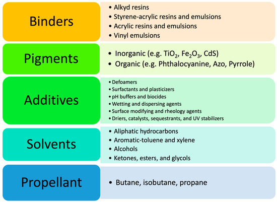 From the chemical point of view [27,28,29], synthetic paints used in spray cans mainly comprise (i) a binder medium, a transparent film-forming material in which the pigment particles are dispersed and, once the drying process is complete, they form the pictorial film; (ii) pigments which give colour to the paint; (iii) a solvent capable of solubilising the pigment/binder mixture; (iv) additives, for several different purposes and to lend specific properties to the paint layers (Figure 2) [30,31]. From recent studies on the identification of Street Art spray paint materials [32,33], the mostly used binder media are alkyd, styrene acrylic, acrylic-based resins, and vinyl emulsions. However, spray cans are not the only painting tools used by street artists. In some cases, paint cans and the application by brushes and rollers are preferred both for economic reasons, for the easier applicability that allows for spreading the product over larger areas, and for the possibility to act directly on the paint mixture obtaining the ideal colour rendering the desired results by artists. In this case, the same synthetic polymers present in the spray cans were reported also in paint cans, with the addition of acrylic, styrene acrylic, and vinyl emulsions [34,35].