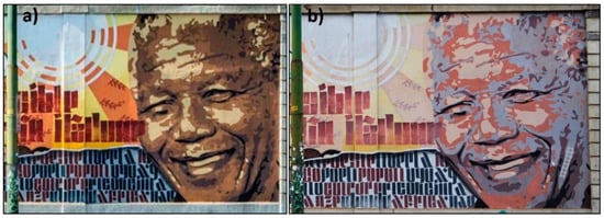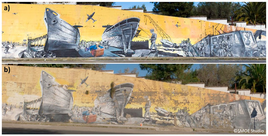Effects of outdoor exposure on contemporary mural “Emigranti” by SMOE Studio in Catanzaro (Italy). (a) The artwork in 2017 when it was realised; (b) the state of conservation after four years in 2021. Images courtesy of SMOE Studio.
