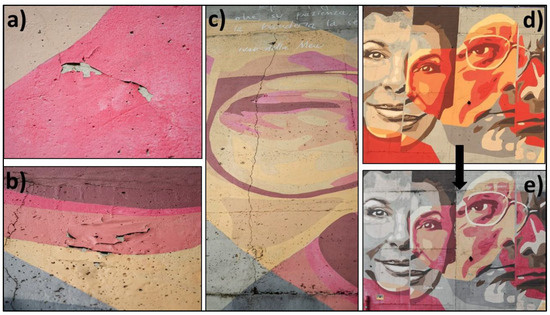 Images from the contemporary mural “Musica Popolare” by Orticanoodles (Milan, Italy): examples of deterioration patterns that can be observed on contemporary murals. (a) Flaking; (b) scaling; (c) fracture of the substrate; (d) original colour of the artwork realised in 2016 and (e) colour fading observed.