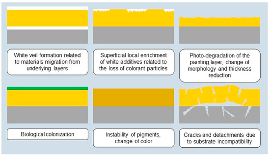 Some of the examples of physical damages are paint losses with a crack pattern that follows the bricks underneath [57]; craquelure formation (involving only the paint layer), associated with increased porosity of the substrate and higher roughness of the paint surface [67,69]; wrinkling related to the presence of plasticisers sensitive to temperature variations during the day [50,51]; shrinkage caused by photodegradation [70]; incompatibility problems due to non or incorrect preparation of the substrate [52,69].