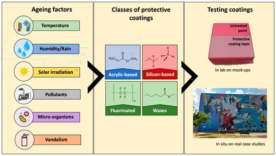 - Macchia, A.; Capriotti, S.; Rivaroli, L.; Ruffolo, S.A.; La Russa, M.F. Protection of Urban Art Painting: A Laboratory Study. Polymers 2022, 14, 162. [Google Scholar] [CrossRef]