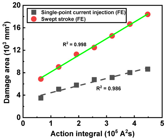 The relationship between the total damaged area and the action integrals of the current waveforms used in the FE model were calculated and the results are shown in Figure 7. The varying action integrals are achieved by adjusting the peak current of the lightning current waveform, and the parameters used in the FE models are listed in Table 3. The total lightning-damaged area is linearly proportional to the action integrals of the current waveform during a single-point current injection, which is consistent with the literature [25]. As shown in the figure, the predicted damaged area from the swept stroke model is much larger than that of a single-point current injection, even though they have the same action integrals.