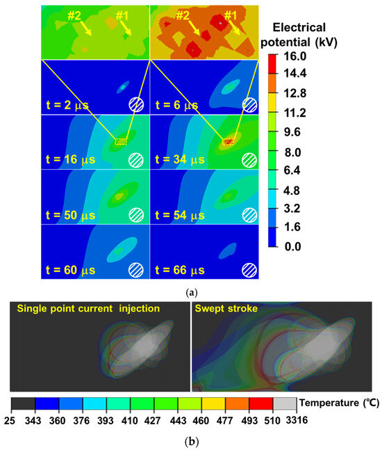 (a) Electrical potential distribution contours in the CFRP’s top ply under 112 kA swept stroke with two lightning attachment points. (b) Projected lightning-damaged areas of CFRP composite under single-point current injection stroke and swept stroke.