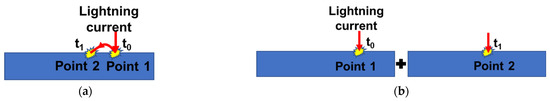 The electrical potential coupling effect is dependent on the skip distance and the applied current amplitude of lightning channels. A parametric study on the swept stroke FE model was performed to examine the effect of skipping distance and current magnitude on lightning damage in a CFRP laminate. Figure 10 shows the schematic of the swept stroke FE model developed with two different approaches: (1) the single swept stroke and (2) the superposition of two single-point current injection. The first approach (Figure 10a) is a swept stroke model with two attachment points (0.02 m skip distance and 0.005 ms dwell time from Table 4). The second approach (Figure 10b) is a superposed model that two single-point current injection FE models are performed with an attachment point at point 1 (from 0 ms) and point 2 (from 0.005 ms). In this case, local electrical potential and thus the temperature are calculated from each of two current injections, and they have coupled each other. Figure 11 shows the electrical potential at the initial attachment point of the laminate (point 1) in the thickness direction predicted from 11.2 and 112 kA swept strokes, respectively. At 11.2 kA swept stroke, the predicted electrical potentials by the swept stroke FE model (Figure 10a) are the same with those by the superposed FE model (Figure 10b), indicating that the coupling effect between two adjacent lightning attachment points is insignificant. In contrast, at 112 kA swept stroke, the results predicted by the swept stroke FE model are different from those by the superposed FE model up to the penetration depth of 1.2 mm. This indicates that the electrical potential coupling effect should be considered.