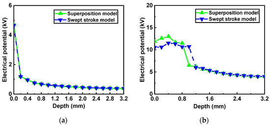 Through-thickness electrical potential variation at the initial point during a swept stroke with a peak current of (a) 11.2 kA and (b) 112 kA.
