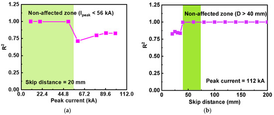 where is the value of the electrical potential by the superposed model as shown in Figure 10b at point 1 in the in-depth direction. is the value of the electrical potential by the sweep stroke FE model as shown in Figure 10a along the same path. is the average value of the . As depicted in Figure 11a, the relationship between R2 and the peak current when the skip distance is set as 20 mm. The R2 is nearly equal to 1 up to 56 kA, indicating that the results obtained by the sweep stroke model (Figure 10a) are equivalent to those from the superposed single-point current injection FE model Figure 10b. However, once the magnitude of the applied current is greater than 56 kA, the R2 drops to 0.75 and remains at a stable range between 0.7 and 0.8 with the increase of peak current. This suggests that the coupling effects become significant at higher peak current (>56 kA) coupled with 20 mm skip distance, thus the swept stroke approach (Figure 10a) must be employed to predict electrical potentials and corresponding lightning damage. Figure 12b illustrates the relation between the R2 and the skip distance under a peak current of 112 kA. The R2 was equal to 1 when the skip distance is greater than 40 mm, which indicates that the coupling effect is insignificant. When the distance between strike points is smaller than 35 mm, the coupling effect is significant and swept stroke FE model should be considered in the lightning damage prediction.
