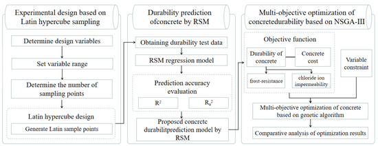 The durability of concrete mainly considers frost resistance and chloride ion permeability, as these two factors directly affect the long-term performance and safety of concrete structures. The frost resistance of concrete refers to its performance under low temperatures and freeze−thaw cycling conditions. The volume expansion of water in concrete during freezing may lead to the generation and expansion of microcracks, thereby reducing the structural integrity and load-bearing capacity of the concrete. In cold winter regions, frost resistance is a key factor in ensuring the integrity and safety of concrete structures; the impermeability of chloride ions involves the permeability resistance of concrete to chloride ions. The penetration of chloride ions (mainly from salt water or seawater) is one of the main reasons for the corrosion of steel bars in concrete. Corrosion of steel bars can seriously affect the integrity and durability of concrete structures. Therefore, improving the impermeability of concrete to chloride ions can effectively prevent steel corrosion and prolong the service life of concrete structures. By improving these two properties, the durability and service life of concrete structures can be significantly improved [12,13,14,15,16]. Numerous scholars have studied the parameters that affect the durability of concrete, and the research results indicate that the frost resistance and chloride ion permeability of concrete are mainly influenced by the mix ratio of raw materials such as cement, water, aggregates, and additives [17,18,19,20,21]. These factors determine the durability and service life of concrete structures. Currently, most people refer to the “General Concrete Mix Design Code” [22] for mix proportion design and employ orthogonal experiments to seek the optimal mix. However, when using orthogonal experiments to find the best mix, there are drawbacks, such as a substantial workload, low predictive accuracy, and suboptimal results [23,24,25]. Additionally, it cannot establish a clear functional relationship between factors and response values in a specified region [26,27].