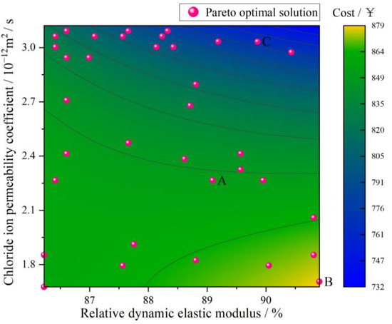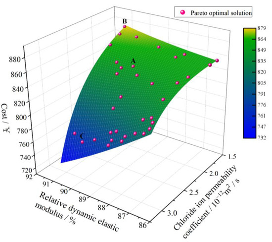 Figure 6 illustrates the Pareto solution set obtained through the optimization of the mix ratio for high-performance fiber-reinforced concrete using the NSGA-III algorithm. On the horizontal axis of the figure, the relative dynamic elastic modulus and chloride ion permeability of high-performance concrete are depicted, serving as parameters to assess the durability of the concrete. Meanwhile, the vertical axis represents the cost associated with high-performance fiber-reinforced concrete.