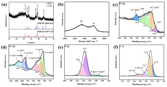 (a) X-ray diffraction pattern, (b) Raman spectrum, and (c–f) high-resolution XPS spectra of FeP/C@CoP.