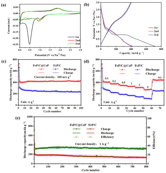 The electrochemical performance of the FeP/C@CoP composites was systematically examined in coin cells (CR2032), employing sodium as the counter electrode. Cyclic voltammogram (CV) curves of the composites were utilized to probe the detailed electrochemical behavior during the Na+ insertion/extraction processes and were conducted at a scan rate of 0.1 mV s⁻1 within the range of voltage from 3.0 to 0.01 V vs. Na+/Na. As illustrated in Figure 4a, during the first cathodic scan, a broad peak was observed at 0.5 V, corresponding to the sodium-ion insertion into the CoP and FeP [38], along with the irreversible reaction associated with SEI formation [27]. In subsequent sweeps, a noticeable decrease in the peak intensity and integral area indicated an irreversible capacity, attributed to SEI formation. The primary cathodic peak shifted to 1.0 V, a common phenomenon in LIBs and SIBs resulting from substantial structural or textural modifications during the process of initial discharge. During the anodic scan, another broad peak at 1.5–2.2 V corresponded to the sodium-ion extraction from the matrix. The CV profiles demonstrated the good electrochemical reversibility of the electrode materials during the discharge–charge cycles, particularly at the second and thi3rd cycles. According to the CV results and the analysis of the related literature [39], the charge and discharge process of FeP/C@CoP can be depicted as follows: