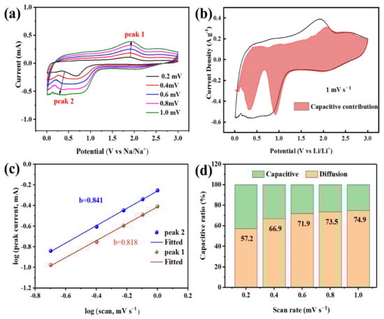 (a) CV curves at different scan rates, (b) CV curve with capacitive contribution shaded area at scan rate of 0.2 msV s−1, (c) the b value graph, and (d) the contribution rate of capacitance.