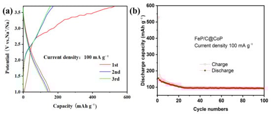 Electrochemical performance tests of these cells were carried out in the voltage range from 0.01 to 2.5 V using a battery test system (LAND CT2001A, Wuhan, China). Cyclic voltammetry (CV) and electrochemical impedance spectroscopy (EIS) measurements were recorded using an electrochemical workstation (CHI660E, CH Instruments, Shanghai, China). A full cell was assembled with commercial Na3V2(PO4)3 as the cathode and FeP/C@CoP as the anode in 1 M NaClO4 in EC:DEC (volume ratio 1:1) with 5% FEC as the electrolyte. The cathode-to-anode mass ratio was approximately 3.2:1.