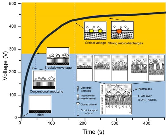 The formation mechanism of MAO coatings is essentially similar, regardless of the electrolyte or control mode used. Taking the constant current mode as an example, Figure 1 illustrates the changes during the MAO process. In the first stage, as the current increases, the voltage linearly increases, initiating the traditional anodic oxidation phase, involving only electrochemical reactions. At this stage, a porous insulating film with a columnar structure perpendicular to the substrate is formed on the metal substrate, accompanied by gas generation, serving as precursors for igniting plasma discharge [21].