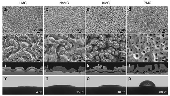 The electrolytes used on the surface SEM (a–d) are Li2B4O7, Na2B4O7, K2B4O7, and Na2HPO4, respectively. From top to bottom are the corresponding enlarged view (e–h), the cross-sectional view (i–l), and the water contact angle (m–p). LiMC, NaMC, and KMC are “cortex-like”, and PMC is “volcanic crater-like” [35].