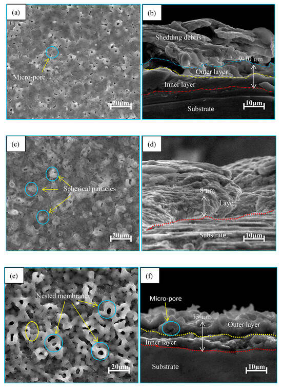 Surface and cross-sectional SEM of MAO coatings on three substrates (Ti: (a,b); Ti-6Al-4V: (c,d); Ti-35Nb-2Ta-3Zr: (e,f)) under the same conditions [80].