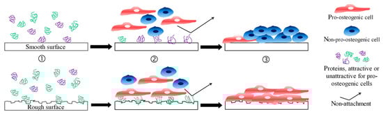 A diagram illustrates the interaction between cells and materials on smooth or textured surfaces; ① surface structure influences protein adsorption, ② proteins impact cell attraction, and attachment, and ③ proliferation, differentiation, and maturation [90].