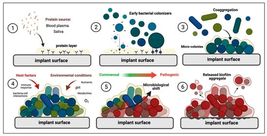 Microbial cells adhering to surfaces can come together to form highly structured microbial communities commonly known as “biofilms”. These biofilms often display drug resistance, complicating infection treatment. The process of biofilm formation involves various stages, including the adsorption of proteins, microbial adhesion, aggregation, biofilm maturation, and the diffusion of biofilm (Figure 6). Proteins adhere to surfaces, facilitating microbial attachment through electrostatic interactions and protein receptor recognition. As attachment progresses, biofilm formation occurs as microorganisms aggregate. Once established, biofilms involve intercellular communication and extracellular polymeric substance (EPS) secretion, transforming into a three-dimensional structure [119].