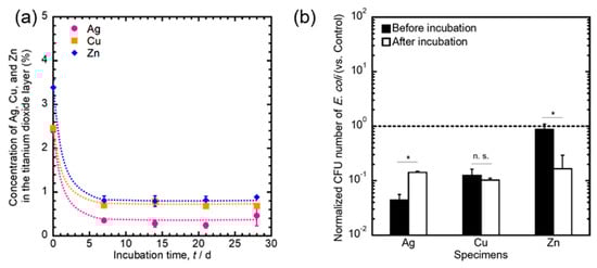 - Shimabukuro, M.; Hiji, A.; Manaka, T.; Nozaki, K.; Chen, P.; Ashida, M.; Tsutsumi, Y.; Nagai, A.; Hanawa, T. Time-Transient Effects of Silver and Copper in the Porous Titanium Dioxide Layer on Antibacterial Properties. J. Funct. Biomater. 2020, 11, 44. [Google Scholar] [CrossRef] [PubMed]