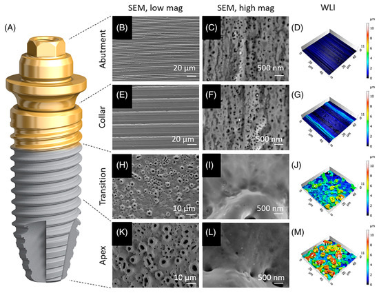 The ideal implant surface should mimic natural bone, featuring mineralized large pores and nanoscale components. Hierarchical structure, from the nanoscale (collagen molecules and minerals) to microscale (bone units), guides cells’ behavior [92]. Research suggests that multiscale topographical features on the implant surface are linked to increased osteoblast differentiation [93].