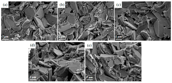 where d, a, and c represent the crystal plane spacing and lattice parameters, correspondingly. Table 1 displays the lattice constants a and c of Bi1−xNaxCuSeO1−xFx (x = 0, 0.05, 0.10, 0.15, and 0.20) ceramics. The results indicate that the lattice constant a of the doped samples increases, while the lattice constant c decreases with an increase in the NaF doping amount. The crystal face spacing of the Bi1−xNaxCuSeO1−xFx ceramics is calculated using Equation (2), revealing a negligible change in the crystal face spacing. Consequently, the diffraction peak of the Bi1−xNaxCuSeO1−xFx ceramics does not exhibit any noticeable deviation. Table 1 shows the computation of thegrain size for Bi1−xNaxCuSeO1−xFx ceramics utilizing the Debye−Scherrer formula Dc = 0.89λ/(Bcosθ), where B represents the half-peak width and θ signifies the Bragg diffraction angle. The results indicate that the mean grain sizes of Bi1−xNaxCuSeO1−xFx (x = 0, 0.05, 0.10, 0.15, and 0.20) ceramics are 1.92 μm, 1.63 μm, 1.66 μm, 1.68 μm, and 1.72 μm, respectively. The fracture morphology of Bi1−xNaxCuSeO1−xFx (x = 0, 0.05, 0.10, 0.15, and 0.20) ceramics is depicted in Figure 2, demonstrating the presence of layered structures, good crystallinity, and a void-free surface. Based on Figure 2, the Bi1−xNaxCuSeO1−xFx ceramics exhibit tightly stacked grains, with an average grain size of approximately 2 um and minimal variation. These results aligns with the results obtained in calculations using the Scherrer formula.