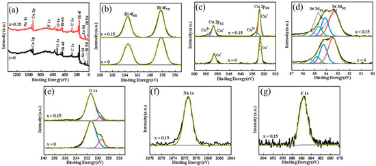 (a) Full spectrum of Bi1−xNaxCuSeO1−xFx (x = 0, 0.15) ceramics, (b) Bi 4f, (c) Cu 2p, (d) Se 3d, (e) O 1s, (f) Na 1s, (g) F 1s high-resolution spectrum.