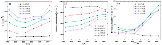 (a) Electrical conductivity, (b) Seebeck coefficient S, and (c) PF as a function of temperature for Bi1−xNaxCuSeO1−xFx (x = 0, 0.05, 0.10, 0.15, and 0.20) ceramics.