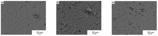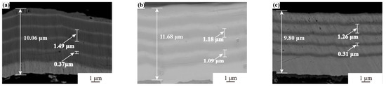 Figure 3 shows the cross-sectional morphologies of the prepared TiN/Ti coatings. The coating structure was observed using backscattered electrons (BSEs) [30,31]. The total thickness of each coating is between 9 and 12 μm, as shown in Figure 3. The multilayer coating structure is identifiable using its contrast, with the Ti layer appearing light and the TiN layer appearing dark. The thickness of the TiN ceramic layer decreases with the modulation ratio in the order of 1.49 μm, 1.18 μm, and 0.31 μm. While the Ti layer thickness is 0.37 μm, 1.09 μm, and 1.26 μm, respectively. The thickness ratios are close to 4:1, 1:1, and 1:4. In addition, the thickness of the Ti transition layer of each coating is about 2.0 μm. A thick Ti transition layer can effectively alleviate the differences in physical properties between hard coatings and 2A70 aluminum alloy substrates.