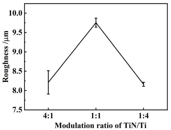 Figure 1 shows the coating surface of the TiN/Ti coatings (TiN/Ti-4:1, TiN/Ti-1:1, and TiN/Ti-1:4) after deposition. It shows that when the TiN/Ti modulation ratio is 1:1, the spallation of the coating is obvious, showing rough and non-uniform holes. Metal droplets are observed on the coating surface. These droplet protrusions can easily become a concentrated site of erosion or fatigue or lead to a coating that is more susceptible to cracks and spalling. Figure 2 shows the roughness of the prepared TiN/Ti coatings. The TiN/Ti-1:1 has the largest roughness value, and the coating surface quality is the worst. The surface roughness value of TiN/Ti-4:1 and TiN/Ti-1:4 is similar. The surface roughness results are the same as the surface morphology of the TiN/Ti coatings shown in Figure 1.