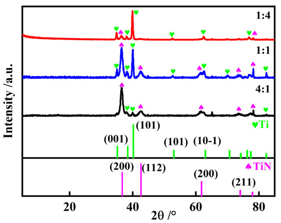 Figure 4 exhibits the X-ray diffraction profile of three coatings. It demonstrates the presence of both Ti and TiN phases in all three modulation ratios, which suggests that the multilayer coatings consist of a combination of metallic titanium and titanium nitride. The concentration of Ti and TiN phases varied with the modulation ratio. For TiN/Ti-1:1, the peaks corresponding to both Ti and TiN phases exhibited the highest concentration. On the contrary, a significant rise in the content of the TiN phase was observed at TiN/Ti-4:1. This suggests that a higher proportion of titanium nitride was incorporated into the coating structure, potentially leading to altered mechanical and chemical properties. Conversely, in the case of TiN/Ti-1:4, the Ti phase exhibited a more prominent presence. This finding indicates that a higher concentration of metallic titanium was present within the coating structure at this modulation ratio. Table 1 shows the chemical composition of Ti and N elements in the TiN/Ti coatings with different modulation ratios. From the table, it can be seen that the content of the Ti element in the prepared TiN/Ti coating is slightly higher than that of the N element. This means that in the prepared TiN/Ti coating, TiN was a non-stoichiometric TiNx.