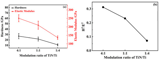 (a) Hardness and elastic modulus values of TiN/Ti-4:1, TiN/Ti-1:1, and TiN/Ti-1:4. (b) H3/E2 values of TiN/Ti-4:1, TiN/Ti-1:1, and TiN/Ti-1:4.