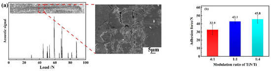 The adhesion force between the TiN/Ti coatings and the substrate were analyzed using a scratch tester. The scratch test results of the TiN/Ti-1:1 coating are shown in Figure 6a. When the applied force is below 30 N, the coating surface remains intact without any signs of cracking. However, upon reaching a loading force of 30 N, surface cracks become evident, aligning with the cohesive force of the coating. Subsequently, as the loading force escalates to 45 N, a progressive rise in sound signals is observed. The examination of scanning electron microscopy results indicates a discernible separation between the coating and the substrate. The adhesion force of the TiN/Ti coatings with different modulation ratios are shown in Figure 6b. The adhesion force of TiN/Ti-4:1, TiN/Ti-1:1, and TiN/Ti-1:4 are 32.9 N, 42.1 N, and 45.8 N.