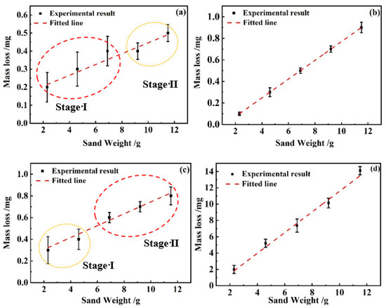 Figure 7 shows the erosion mass loss with the sand supply for the TiN/Ti multilayer coatings and aluminum alloy. The mass loss has an overall linear relationship with the amount of sand supplied. With an increase in the sand supply, the coating mass loss shows an increasing trend. Furthermore, there are still slight differences between each coating at different erosion stages. In Figure 7a, for TiN/Ti-4:1, two different mass loss stages can be observed before and after the 6.9 g sand supply. When the sand supply falls below 6.9 g, in stage I, marked by a red dashed circle in Figure 7a, the local slope surpasses the overall slope, resulting in an increased erosion rate and more severe mass loss. In the range of 6.9 g to 11.5 g of sand supply in stage II, marked by a yellow dash circle in Figure 7b, the local slope of mass loss is diminished, resulting in a decreasing erosion rate.