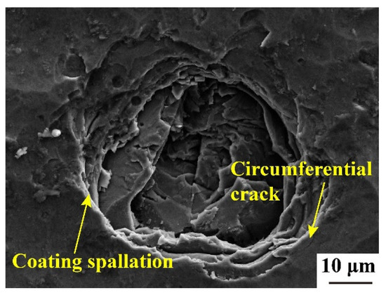 Figure 8 shows the TiN/Ti coating erosion rate obtained using the least-squares fitting method. The erosion rates of TiN/Ti at 4:1, 1:1, 1:4 and 2A70 aluminum were 0.03 mg·g−1, 0.09 mg·g−1, 0.05 mg·g−1, and 1.27 mg·g−1. The erosion resistance of 2A70 aluminum was significantly improved with the TiN/Ti coating. The ability of the TiN/Ti coatings to significantly enhance the erosion performance of aluminum alloy substrates is demonstrated by the findings presented in this study. For multilayer coatings, in addition to the TiN/Ti modulation ratio, the number of coating layers affects the erosion performance of the deposited coating. Cao et al. reported that the erosion rate of a coating is measured at 0.1 mg·g−1 when the number of layers is two. However, the erosion rate significantly decreases to 0.085 mg·g−1 when the number of layers rises to four [33]. The erosion rate starts to increase again beyond this optimal number of layers, indicating a deterioration in the erosion resistance. This demonstrates that the optimum erosion resistance is achieved with a coating consisting of four layers. Figure 9 shows the typical eroded surface of a TiN/Ti coating. The coating spallation phenomenon as well as a circumferential crack was observed.