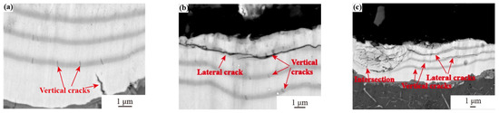 Figure 10 demonstrates the failure process for a TiN/Ti modulation ratio of 1:4 at an erosion angle of 90° when the sand dust feed is gradually increased. Figure 10a–c shows the erosion damage for the sand supply of 2.3 g, 4.6 g, and 11.5 g. It demonstrates that vertical cracks, i.e., cracks along the coating growth direction, appeared in several TiN coatings when the sand supply was low. Furthermore, the TiN coatings at the bottom show a high number of vertical cracks with deeper cracks, i.e., the bottom TiN layer in the figure, while the TiN coating away from the substrate has fewer vertical cracks and shallower cracks. This indicates that the vertical cracks spread from close to the substrate from the bottom up to multiple TiN layers and began to expand gradually. However, since the Ti layer is more difficult to pass through as a toughness layer, it increases the resistance to cracks, and thus, only the propagation of vertical cracks between TiN layers occurs. At the same time, deeper vertical cracks also appeared at the combination of the substrate and the Ti layer, and no lateral cracks appeared. Figure 10b demonstrates that with the gradual increase in the amount of sand supplied, lateral cracks began to appear at the interface of the TiN ceramic coating and the Ti layer, i.e., cracks normal to the coating growth direction. The horizontal cracks extend laterally and widen inward within the Ti coating. Meanwhile, the vertical cracks deepen in the degree of expansion compared with Figure 10a. Due to the successive impacts of the sand, the TiN/Ti multilayered coatings show three major features: (1) vertical cracks on the TiN coatings spanning across the Ti layer from close to the substrate; (2) vertical cracks on the TiN coating extend from near the substrate across the Ti layer; and (3) lateral cracks in the TiN coating extend toward the Ti layer, and the lateral cracks are deeper. Ti, as a ductile layer, is relatively thick and thus has a high resistance to crack extension, which is manifested by the use of layer-by-layer spalling. As shown in Figure 10c, when the amount of sand supplied is further increased, the lateral cracks also extend. Once the vertical crack expands to cross the lateral crack, it will cause a wide range of failures and eventually lead to the spalling phenomenon.