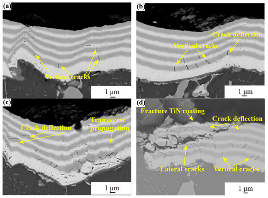 Figure 11 demonstrates the failure process of TiN/Ti-4:1 at an erosion angle of 90° when the sand supply is 2.3 g, 4.6 g, 6.9 g, and 11.5 g. Figure 11a shows that vertical cracks appeared at the TiN coating nearest to the substrate at a lower sand supply. Figure 11b shows that as the sand supply rises, the crack number and width increase. Crack deflection along the interface of the Ti and TiN layers is observed. Figure 11c shows more vertical crack deflection in TiN. Since the Ti layer thickness is not as thick as that of the multilayer coating with a modulation ratio of 1:4, the cracks in the TiN layer could pass through the Ti layer. Also, the lateral cracks have a tendency to expand horizontally. In Figure 11d, the coating shows overall spalling. A larger number of densely distributed vertical cracks, vertical cracks, progressively expanding lateral cracks, and cracks deflected horizontally occurred on all TiN layers, which together led to bulk spalling.