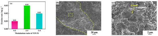 (a) Erosion loss rates of the TiN/Ti multilayer coatings under 90°. (b) Typical surface erosion morphology of the TiN/Ti-1:1 multilayer coatings. (c) Enlarged view of the yellow dashed square in (b).