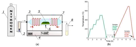 Scheme of biochar production via pyrolysis: (a) setup and (b) temperature regime. 1: Nitrogen reservoir, 2: electronic flow meter, 3: heating element, 4: control unit, 5: biomass samples, 6: K-type thermocouple, 7: cylindrical quartz reactor, 8: water seal.