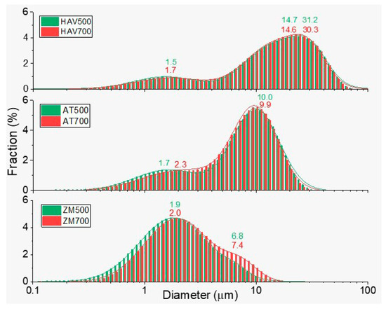 Biochar particles have a wide size distribution, from 0.2 to 70 μm. An analysis of the particle size showed that the HAV samples have a trimodal distribution, while the AT and ZM samples have a bimodal distribution, which can be perfectly described with a lognormal function (Figure 4):