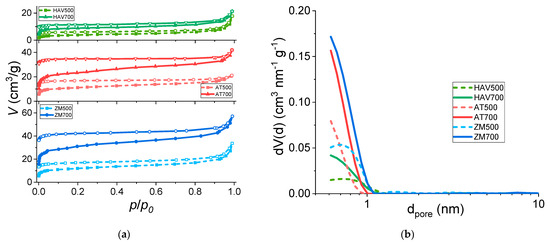 In particular, among the biochars investigated here, the pore size distributions exhibited their maximum at approximately 0.7 nm for HAV500 and ZM500. On the other hand, the most probable pore size for the remaining materials was found to be below 0.7 nm. This variation in pore size distribution indicates subtle differences in the porous characteristics of the biochars, which can influence their adsorption capacity and selectivity for different target substances.