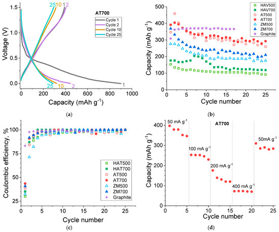 (a) Galvanostatic charge and discharge curves for the cell with AT700; (b) cycling performance of the cells with the studied biochars; (c) Coulombic efficiency at a current density of 36 mA g−1; (d) cycling performance of the cell with AT700 at different charge–discharge rates.