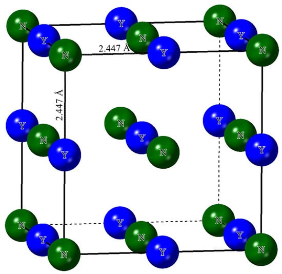 The starting structure (YN) was obtained from the crystallographic open database []. The cell was a simple cube, with an Fm3m space group, number 225 (Figure 1), and a lattice constant of 4.894 Å. The Y-N bond was found to be 2.447 Å (Figure 1). The original structure consisted of 8 atoms: 4 of Y and 4 of N. Upon creation of 2 × 2 × 2 supercells (Figure 2a) containing 64 atoms (32 of Y and 32 of N), the structures were alloyed by replacing some of the Y atoms with those of Nb and Zr, as shown in Table 1. The alloyed structures are shown in Figure 2, which shows only a representation of one structure in each category, as presented in Table 1. It is worth noting that the number of N atoms was kept constant at 32 throughout, and only those of Y were substituted with those of Nb and Zr. The samples were given sample identities, as shown in Table 1. Co-alloying was also performed, where both Nb and Zr atoms were incorporated into the YN structure. For the Y-N-Nb-Zr samples, the number of Y atoms was kept constant at 12, and the number of atoms of Nb and Zr was varied, as shown (Table 1).
